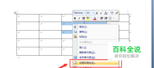 打开word文档,在表格上选中需要加粗的单元格,点击鼠标右键,选中”边框和底纹“的选项。