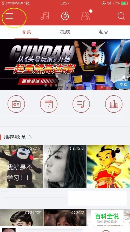 进入网易云音乐首页,点击左上角的三条横线标志(如图);