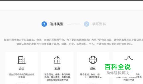 核审通过后(几个小时就可以核审结束了),可以选择类型(企业,政府,媒体,其他组织)。