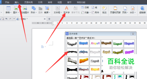 打开WPS,在最上方的菜单栏中选择插入,之后点击艺术字,选择第二行和第一列交汇的地方的艺术字。