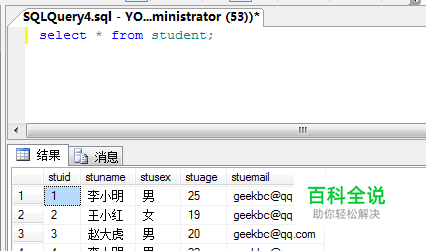 当然,我们甚至可以把年龄是23岁设置显示为大龄,否则为正常. select stuid as 编号, stuname as 姓名, stusex as 性别, case when stuage>='23' then '大龄' else '正常' end as 年龄 , stuemail as 电子邮箱 from student;