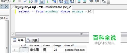 我来显示一下我数据库表中年龄大于20岁的,这条语句很简单. select * from student where stuage >20; 我们看到已经用select把自己想要的结果显示出来了.