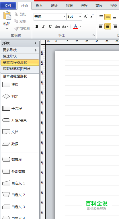 点击创建基本流程图后,就会出现绘制图形的界面,我们可以看见窗体左边会出现各种形状来供我们选择