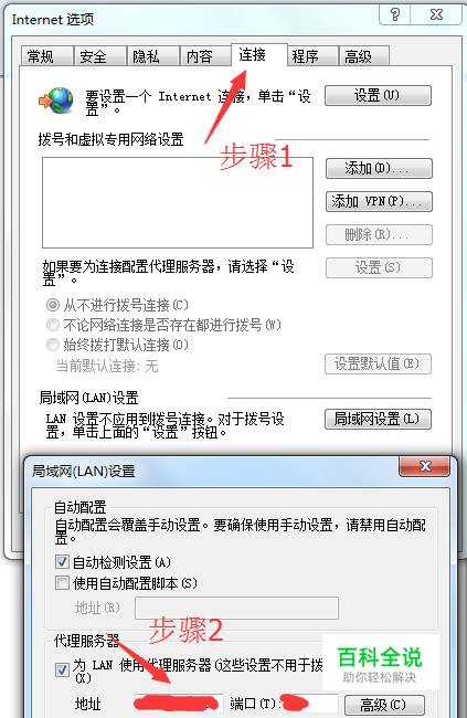 打开浏览器,选择下第一个图箭头所指的设置选项,弹出INTERNET选项的对话框,然后如下第二个图所示,选择其中的“连接”,如步骤一所示。