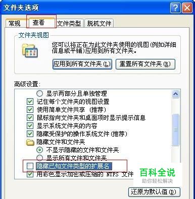 在弹出的界面,选择“查看”,将里面的“隐藏已知文件类型的扩展名”取消勾选,点击“应用”如下图: