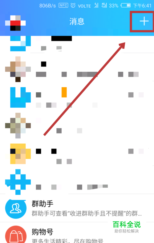 打开手机QQ,在界面右上角找到一个【+】的图标,点击进入。
