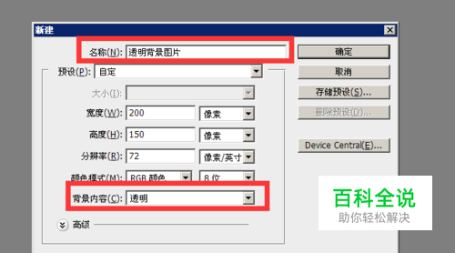 打开ps软件,新建个文档,命名为,透明背景图片,背景颜色选择透明,点击确定。