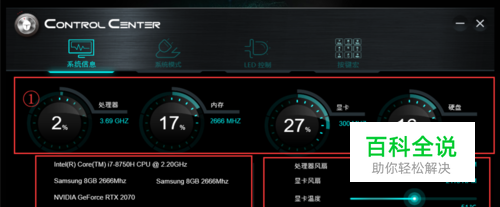 雷神911Pro的“控制中心”分为四个板块:系统信息、系统模式、LED控制、按键宏。如图所示,在系统信息板块中,第①部分显示的是硬件的一些频率和占用,第②部分是电脑的基本配置型号,第③部分可以看到风扇的转速,显卡和处理器的温度以及电池的剩余电量。信息显示简单明了。