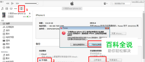 我们需要先运行iTunes软件,并将手机与电脑进行连接,然后依次点击iTunes窗口左上角的手机图标,然后选择“本电脑”并点击“立即备份”按钮,然后在弹出的窗口中点击“不备份应用程序”,如下图所示,我们只需依次点击1,2,3,4处红框所标示的位置即可。