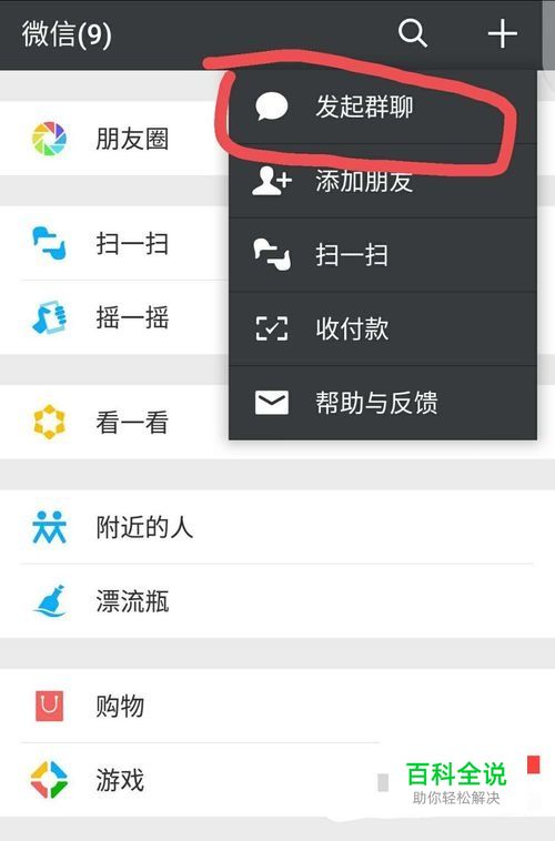 首先打开微信,点击右上角的加号,再点击“发起群聊”。