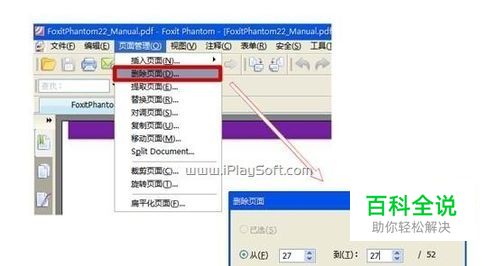 页面管理 页面管理就是对原有的PDF文件页面整个进行添加、删除、更换次序的操作。比如说要删除一个52页的PDF中的第27页,保留其他,那就需要用到页面管理功能。页面管理可以直接在 Foxit Phantom 菜单栏上找到,点击删除按钮后选择你要删除的页码即可删除。