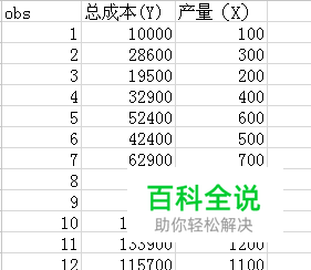 1、案例中需要的数据,该数据是有关某企业总成本和产量的一组数据,是实验数据。