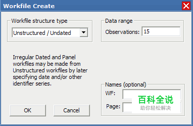 2、创建一个范围在1—15的非时间序列工作文件,使用create命令,创建窗口,将workfile structure type 下拉改为undated,在Observations输入15,如图1,点击OK后出现图2。