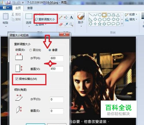 点击工具栏当中的“重新调整大小”,就会出现“依据”“百分比”“像素”来进行调整,我们选择依据像素,可以看到,这张图片的像素是600*450的,输入想要的宽高比,下面有个选择框,默认是“保持宽高比”。
