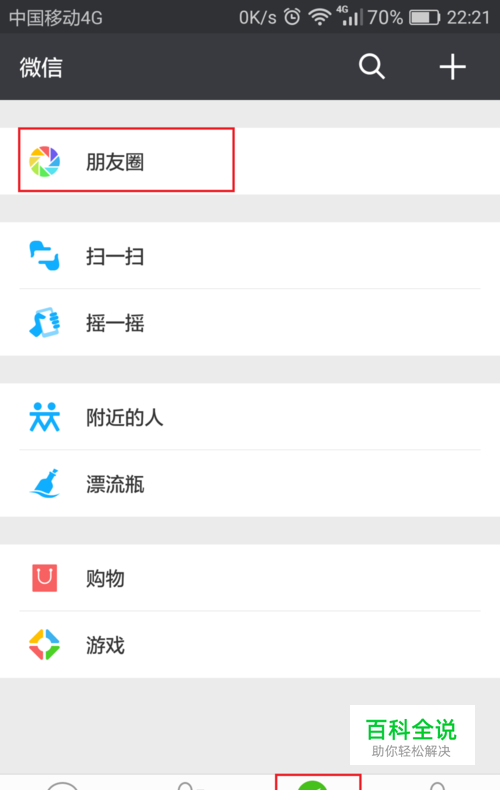 登录微信APP,进入【发现】面板,点击最上面的【朋友圈】按钮,进入朋友圈界面。