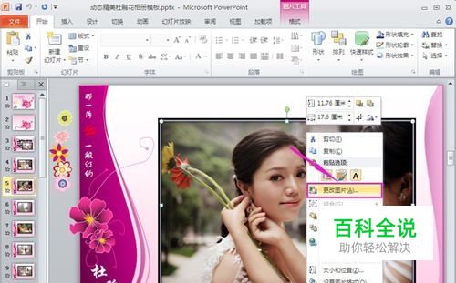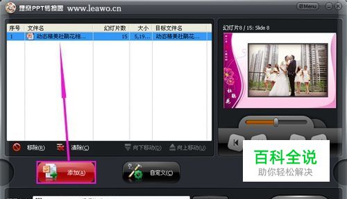 下载之后就可以通过“更改图片”选项来替换电子相册模板中的照片,替换完成之后就可以保存该PPT相册。下面就要用狸 窝照片制作视频软件(又名狸 窝PPT转换器),把PPT相册转换为视频相册并配上背景音乐。打开软件之后,通过“添加(A)”按钮导入PPT文档。