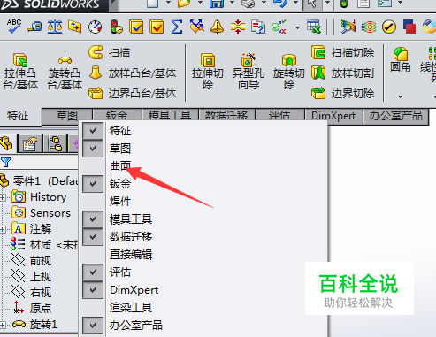 如下图所示在工具栏找到曲面选项并点击进入曲面命令界面,如果工具栏没有曲面一项,那么将鼠标放在特征或草图任意一项上右键即可看到下拉菜单中有曲面项,打勾后曲面命令就会出现在工具栏上。