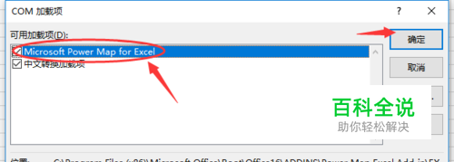 在COM加载项窗口,找到并且勾选“Microsoft Power Map for Excel”,最后点击“确定”选项即可。