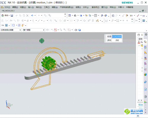 通过解算方案-求解-动画这一系列的步骤,在UG10.0软件下创建出来的齿轮齿条副如下图模拟运动结果;