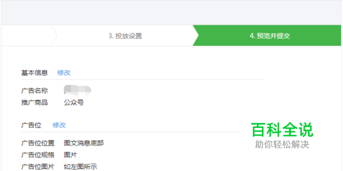 新建广告步骤4-4(预览并提交):查看广告的整体设置,在这一步可以修改“基本信息”、“广告位”和“投放位置”。