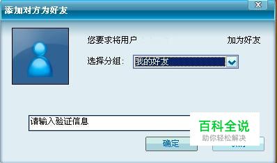 大部分情况下,对方设置的是需要身份认证才能将其列为好友。您需要先输入验证消息,发送并耐心等待。若对方通过验证,在收到的返回信息窗口中即可为其选择相应的分组,成功添加对方为好友。