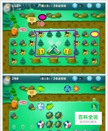 挑战主题第8关:怪物20波 红色和黄色圈处放攻击炮。红圈处升级去打红色方框内的道具,黄圈的初级炮可以应对前几波怪物。把风车附近的飞机和弓箭打出来后,在出口放雪花,升到最高级,后面的局面就可以控制住了。总之有钱就先升级雪花,然后升级飞机。