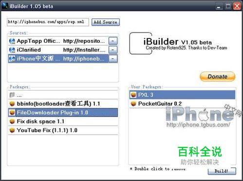 3.在Add Source按钮前,填写你想加入的源地址,例如我们的中文源 http://iphonebus.com/apps/rep.xml ,点击Add Source后,iBuilder会加载该源地址下的所有软件或者补丁。