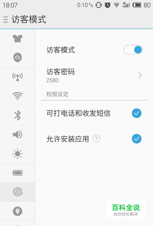 手机设置—找到安全之类的地方—访客模式打开—设置密码—记得允许下载安装应用