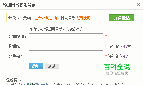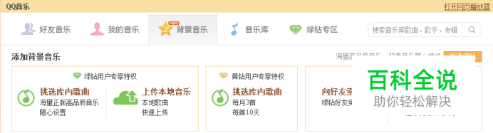 大家还在买蓝钻设置QQ背景音乐吗?其实有更好的设置QQ背景音乐的方法哦,下面让我来跟大家分享下我的背景音乐的设置方法吧。 1 第一步。先进入自己的QQ空间。在 我的空间 点击 音乐。如下图 2 第二步。点击QQ音乐里的背景音乐。然后点开添加网络背景音乐。如下图 3 第三步:我们点击进入到 QzSong.Com 首页(这是一个简单设置的背景音乐的网页)从网站搜索自己喜欢的QQ音乐,复制MP3格式或者WMA格式的QQ音乐链接。 4 第四步:填好链接,歌曲名字,歌手名字。点击添加就完成了。 5 第五步:刷新下空间内容,就可以在自己空间欣赏到喜欢的音乐了。