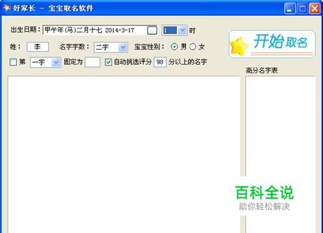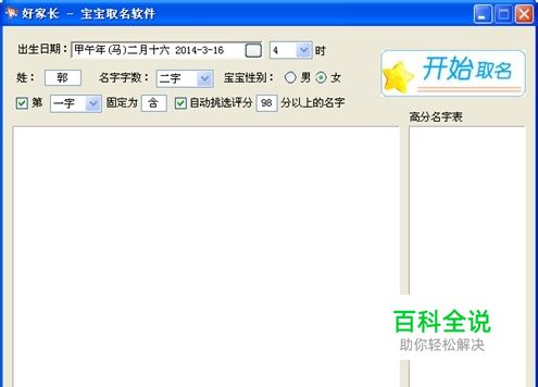 我现在已经是妈妈级别的人了,记得刚开始怀孕时,我就寻思着宝宝出生以后的名字,那时候对名字的理解并不多,只知道好听就可以。后来我把想好的名字告诉老公,他并没有答应要采用我取的名字,当时我还大发脾气。到后来才知道,名字不能随便用,要参照生辰八字。 怀孕那会由于电脑辐射大,就没有走近过电脑,每次都是老公上网。可是一天天过的非常快,眼看宝宝快要出生了,但是老公还没有给宝宝取名字,我感到百般焦急,便问起了老公取名字的事情,他就说不着急。我能不着急吗,这都快生了。就这样,宝宝出生了,是一个可爱的小公主。宝宝出生的第二天,名字就取好了。 之后我就问起老公取名字的事,老公就很深沉说:其实是一款取名软件的功劳,由于比较专业,需要用到出生年月日时和性别,只能等到宝宝出生以后了。而且这款软件的权威性很高,身边的朋友都用的这款软件给宝宝取名,所以就和你卖了这个关子。 打开以后就是这样的界面,接下来,就是根据我们的需求输入相关的项目。 在这在这个界面的上方,我们需要填写出生日期、时间、姓、名的字数、宝宝性别。如果我们需要固定名字中的某一个字,就在上面选择需要固定第几个字,输入所要固定的字。例如:我们想让名字的第一个字是“含”,就选择“第一字”,固定为里面输入“含”,如果我们想把名字的第二个字定为“含”,就选择下拉列表里的“第二字”,固定为里面输入“含”。需要“自动挑选评分”就选择(选择后会出现“√”),选择以后我们选择名字的分数范围。(若不需要就点击小框里“√”)最后我跟老公一起决定了给女儿取名叫郭含雅。我之所以没有取100分的名字就是因为天才是99%的努力+1%的灵感,我希望我的女儿能脚踏实地,所以我给她取了个99分的名字。。。