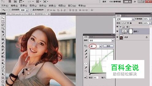 选择“绿”通道,然后将曲线稍稍向上调节,为画面添加一些绿色。