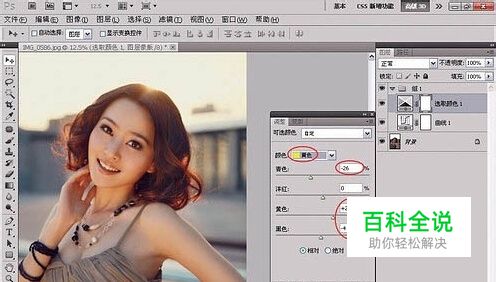 设置“颜色”为“黄色”,然后设置“青色”为-26%,“黄色”为22%,“黑色”为-4%