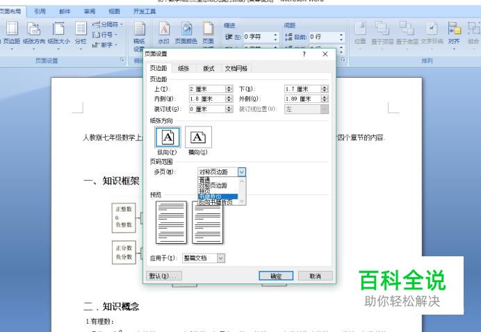 然后在弹出来的界面中,找到“页码范围---多页”的选项里选择“书籍折页”选项。并且“纸张方向”为横向。