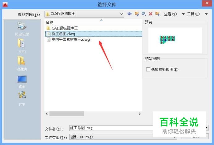 打开CAD之后然后按下Ctrl+O键,在弹出的对话框内我们选择需要的图形文件,如图所示: