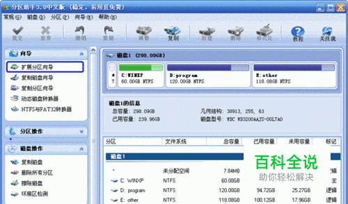1、下载免费的分区助手,然后安装并运行它。您将看到下面的主界面,请点击蓝色圈住的选项“扩展分区向导”。如图1: