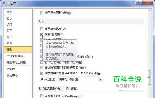 第2步,打开“Word选项”对话框,切换到“高级”选项卡。在“打印”区域选中“后台打印”复选框,并单击“确定”按钮,如图2011121112所示。 图2011121112 选中“后台打印”复选框