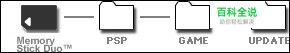 于Memory Stick Duo内,建立可保存更新资料的资料夹。 利用电脑,替Memory Stick Duo新建一个名为「PSP」的资料夹,再于「PSP」资料夹下建立一个名为「GAME」的资料夹。 接着,于「GAME」资料夹下,建立一个名为「UPDATE」的资料夹。