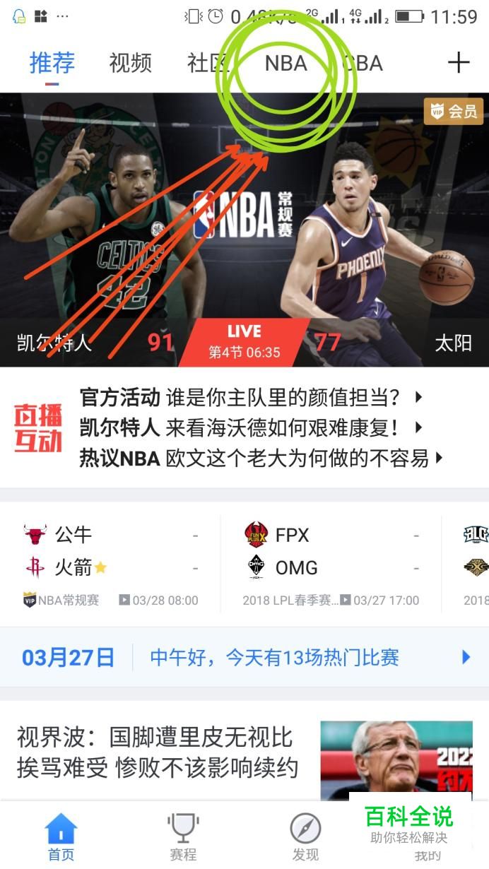 点击弹出页面的“NBA”专区,就可以观看NBA正在直播的各项赛事了哦