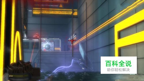 到房顶后顺着管道爬到最高层,然后跳进身后的通风管里,通风管出去后有四个敌人,杀光后到电梯里的尸体上拿频率钥,再杀到另一个房间获得密码。再回到电梯时海水冲了过来,把一些杂物冲了过来挡住了电梯门,按X加右键可以控制水,控制水把障碍物清除掉之后进电梯。到楼上之后遇到障碍都这样清除,遇到敌人的话控制水他们冲到在打,运气好的话可以直接冲死。到这个全是电的房间,控制水流把三个箱子拖过来当成桥,跳到对面的平台。