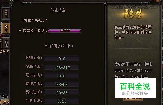 当9377雷霆之怒角色人物达到80级时,便可进行转生操作,角色转生后可获得属性加成,还可佩戴转生级别的装备。那么雷霆之怒转生系统怎么玩呢?角色转生后可以获得哪些属性加成呢? 雷霆之怒转生系统位于角色系统中,快捷键C。当角色达到80级时,便可对角色进行转生。角色转生后可获得物理攻击、魔法攻击、道术攻击、物理防御、魔法防御、生命上限等属性加成,转生等级越高,属性加成就越多。那么怎么转生呢? 角色转生需要消耗转生修为,一转需要转生修为10000,当玩家角色的转生修为达到这个要求后,便可转生到一转。转生等级越高,需要消耗的转生修为就越多。玩家可牺牲等级来兑换转生修为,每天有3次兑换机会,角色等级必须大于80级才可兑换。因此玩家需要将等级提升上去,可通过雷霆之怒降妖除魔任务、护送押镖、装备回收等玩法获取经验值,快速提升等级,用来兑换转生修为。在游戏商城也可使用元宝购买转生丹,内含1万转生修为。 雷霆之怒转生后,便可穿戴转生级别的装备。各等级装备可通过装备副本、野外刷怪、装备合成、宝藏系统等玩法获得,玉佩则需要到荒漠土城的神炉处锻造或者升级,勋章可在荣誉系统使用荣誉值兑换,面具则需要成为游戏VIP玩家方可获得。