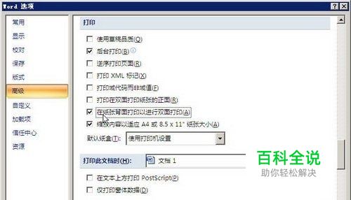 第2步,打开“Word选项”对话框,切换到“高级”选项卡。在“打印”区域选中“在纸张背面打印以进行双面打印”复选框,并单击“确定”按钮,如图2012040224所示。 图2012040224 选中“在纸张背面打印以进行双面打印”复选框