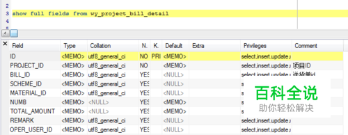 1.查询表字段所有信息 包括备注信息 show full fields from %table% 如:show full fields from wy_project_info