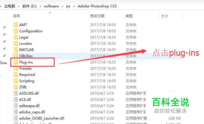 接下来进入到相应版本的PS文件夹下面,这个时候你会看到plug-ins文件夹,我们点击它,如下图所示