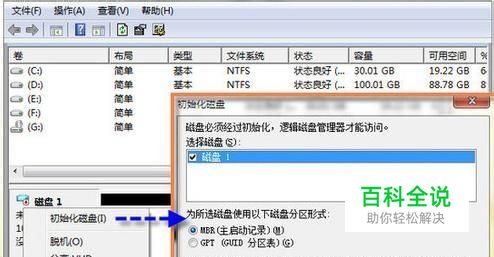 小提示:虚拟硬盘的格式有“动态扩展”和“固定大小”两种选项,选择“动态扩展”项,Windows7系统会根据保存的数据动态调节大小;选择“固定大小”项,则表示虚拟磁盘的大小是固定的。 二、初始化虚拟磁盘 在Windows7系统中,创建虚拟磁盘很简单,但是刚创建好的虚拟磁盘还不能直接使用,还得进行“初始化”。将鼠标指针移动到“磁盘1”上,单击鼠标右键,在弹出的快捷菜单中选择“初始化磁盘”,打开“初始化磁盘”窗口,勾选磁盘,选择分区形式,单击“确定”按钮(如图2),完成虚拟磁盘初始化。