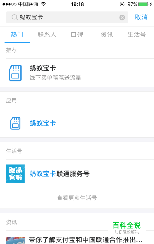 登陆手机支付宝客户端,搜索蚂蚁宝卡,会出现如图所示搜索结果,这里需要大家有两个操作: 1、添加“蚂蚁宝卡联通服务号”,有需要了解的问题可以通过这个服务号了解(不过很多回答都挺官方的,我们也应该都习惯了吧)。 2、点击“蚂蚁宝卡”这个应用(就是图片中的第二个应用)。