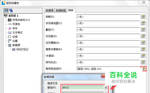 4、切换至“转换”选项卡,点击“前缀和后缀”后面的按钮,输入前缀9002,后缀812,点击确定,点击关闭。已完成BarTender数据之间的关联,可以修改文本数据,查看设置是否无误。