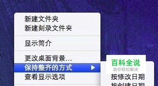 当我们在出现右键菜单时,按住Option键(Alt),便会发现两个变化:“显示简介”变成了“显示查看器”, 和下面的“排列”变成了“保持整齐的方式”。点击“保持整齐的方式”,我们就可以在它的下级菜单中看到许多种排列方式。选择排列方式后,新增到桌面的图标 就会自动按照此规则排列。