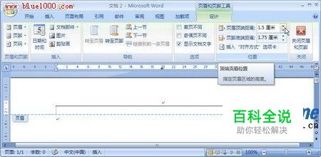 第2步,打开“设计”功能区,在“位置”分组中分别调整“页眉顶端距离”和“页脚底端距离”编辑框的数值,以设置页眉或页脚的页边距,如图所示。