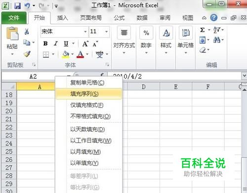Step 1: 运行Excel 2010,在A1单元格输入“日期”,然后在A2单元格输入“2010/4/2”。,向下拖动该单元格的填充句柄,在自动填充选项里选择“以天数填充”,则得到自4月2日至5月1日的所有日期数据。