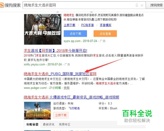 首先在搜狗浏览器中找到绝地求生的官网,如下图,然后点击进入到里面去。